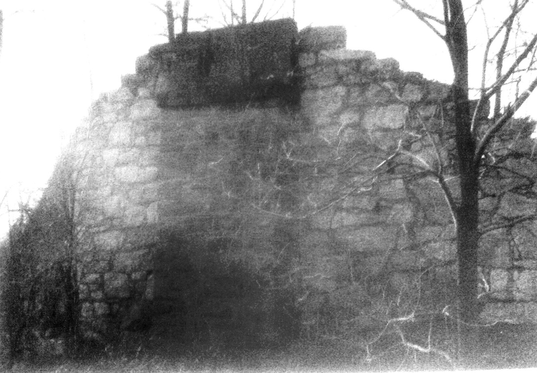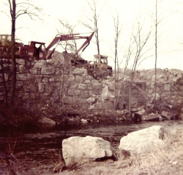 [4.50.1] When the American Legion turned down the Orange station building, they settled in on another part of the NH&D line at 630 Grassy Hill Rd. Behind their building were the abutments for the 'tin bridge' over the Wepawaug River. The photo on the left shows the east abutment. In the photo on the right, the dark area at the bottom is the river flowing at the foot of the one on the west side. The trash barrel is east of the river and may be there because the YMCA ran a swimming camp here in the early 1950s when these photos might have been taken. Both structures show a darker stone column in the center, which was probably the NH&D's original bridge support that was later fortified with the wing walls. The construction of "substantial stone abutments" for a bridge to replace the original crossing of the Wepawaug was noted by the railroad commissioners as completed in 1882 [CRC30.1883.21]. We still are hoping to get more information about the camp and also a photo of the 'tin bridge' itself.