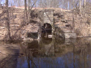 [4.45.2] After a century and a quarter of service, this culvert threatened to collapse a few years ago and was shored up with a concrete insert. All vestiges of the beautiful old stone arch appear to be gone now. The original culvert may have dated to 1882 when the railroad commissioners reported that some of the Platte (sic) valley trestle was filled in [CRC30.1883.21]. Lambert Rd., then called Platt Valley Rd., is to the right of 'Derby' on the 1868 map shot. Note the short diagonal portion of roadway paralleling the track on the eastand the Platt River running under the track and the road at that point. The culvert location is easily visible, when the leaves are off the trees, as seen in these two winter 2011 shots.