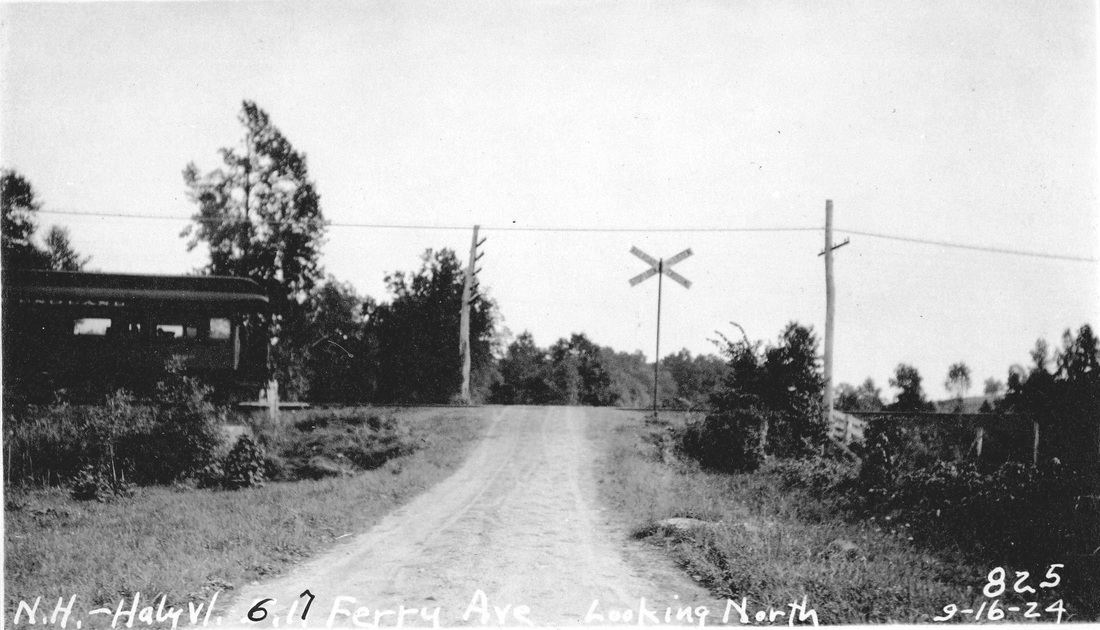 [4.46.2] This looks plausibly like the crossing of what we know as Tyler City Rd. at a correct mileage point of 6.17, with the track curving westward to the Orange Center station. Though the PUC says this point was also known as Malone's crossing, we know of no one else who called this street Ferry Ave. Like the other curiously mislabeled street names that the PUC used, this one would carry through until the 1938 abandonment when the PUC took this Ferry Ave. off its list of state railroad crossings. See the retouched photo at MP 4.43.1 for discussion of the 'real' Ferry Ave.