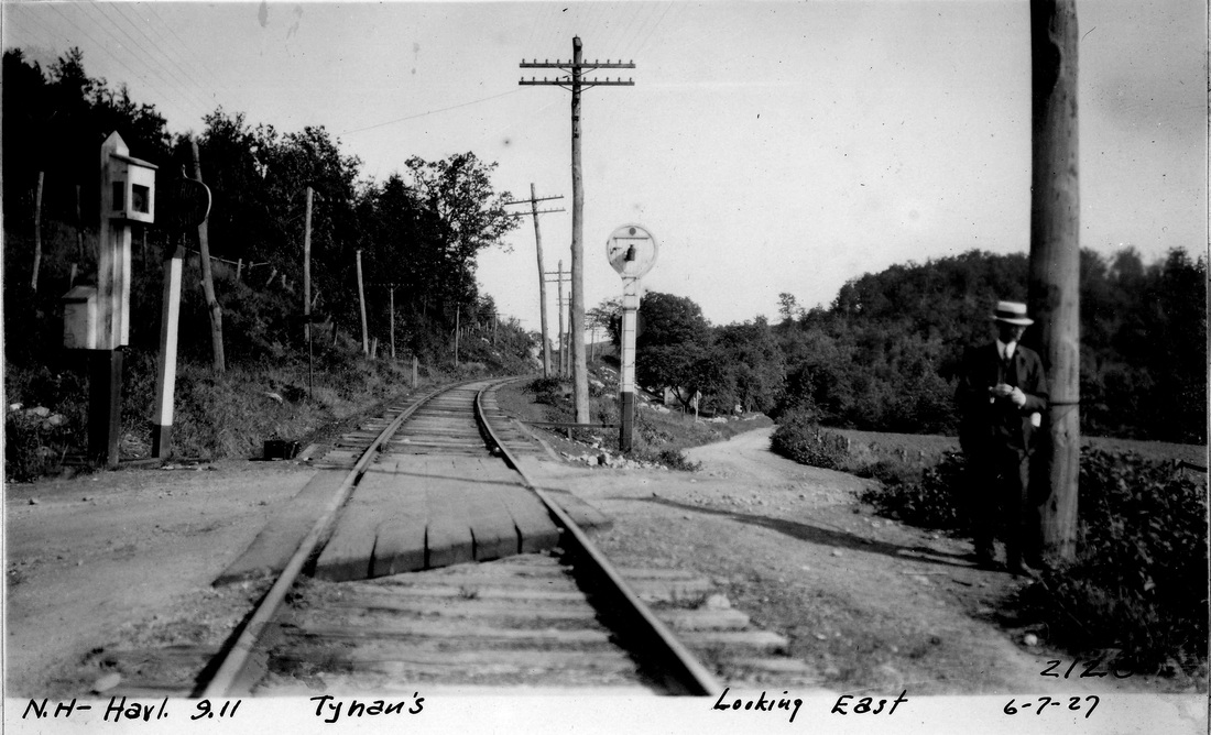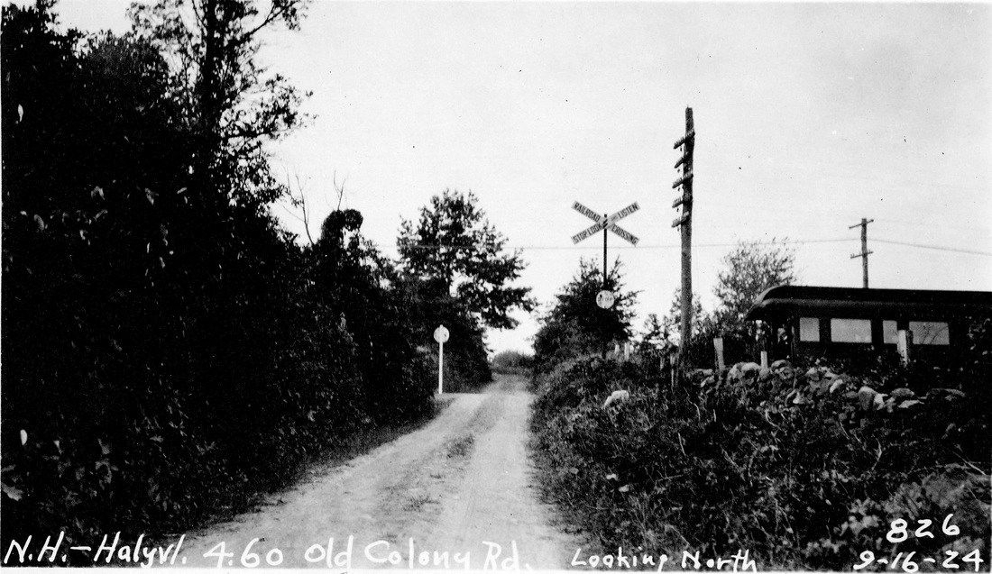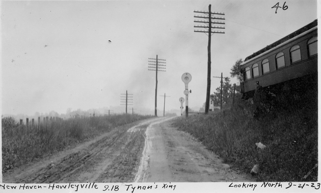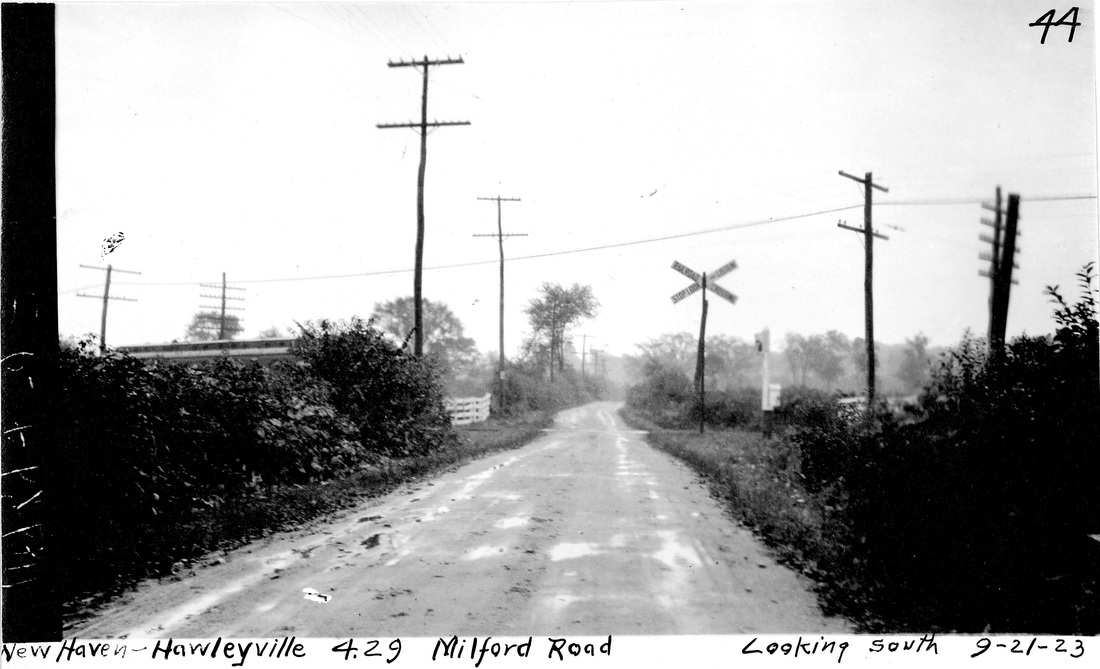 [4.41.3] These photos have mileage point numbers of 4.29 (1923) and 4.23 (1927) which would place them here, but we have never seen this called Milford Rd. otherwise. The PUC perhaps confused the name with Meloy Rd. which you can see on the map above, and which ran to about this point. They do equate this crossing with ALLINGS CROSSING, also called SHELDONS, after prominent resident J. Sheldon Alling. The NH&D had a stop here from August of 1871 until June of 1872 when the Tyler City station opened just to the west. In an accident here in 1905 in which Samuel Casner was killed by a train hitting his car, the location was called Plunkitt's crossing in The New York Times but Allings Crossing in the Hartford Courant [NYT/09/25/1905/09; HC/09/25/1905 /11]. A warning bell was finally installed here on 7/31/15 because of the new fatality of motorcyclist Paul Jansen on 5/31/1915 [PUC Dkt. 1568] and injuries and damages when "northbound" train #1418 struck Daniel Durkin and his double team at 11:55 a.m. on 5/26/1914. The warning devices were removed on 6/16/1927 [PUC Dkt. 4920] shortly after passenger service was discontinued in 1925 and this was made a stop-and-flag crossing for the remaining freight service on the line.