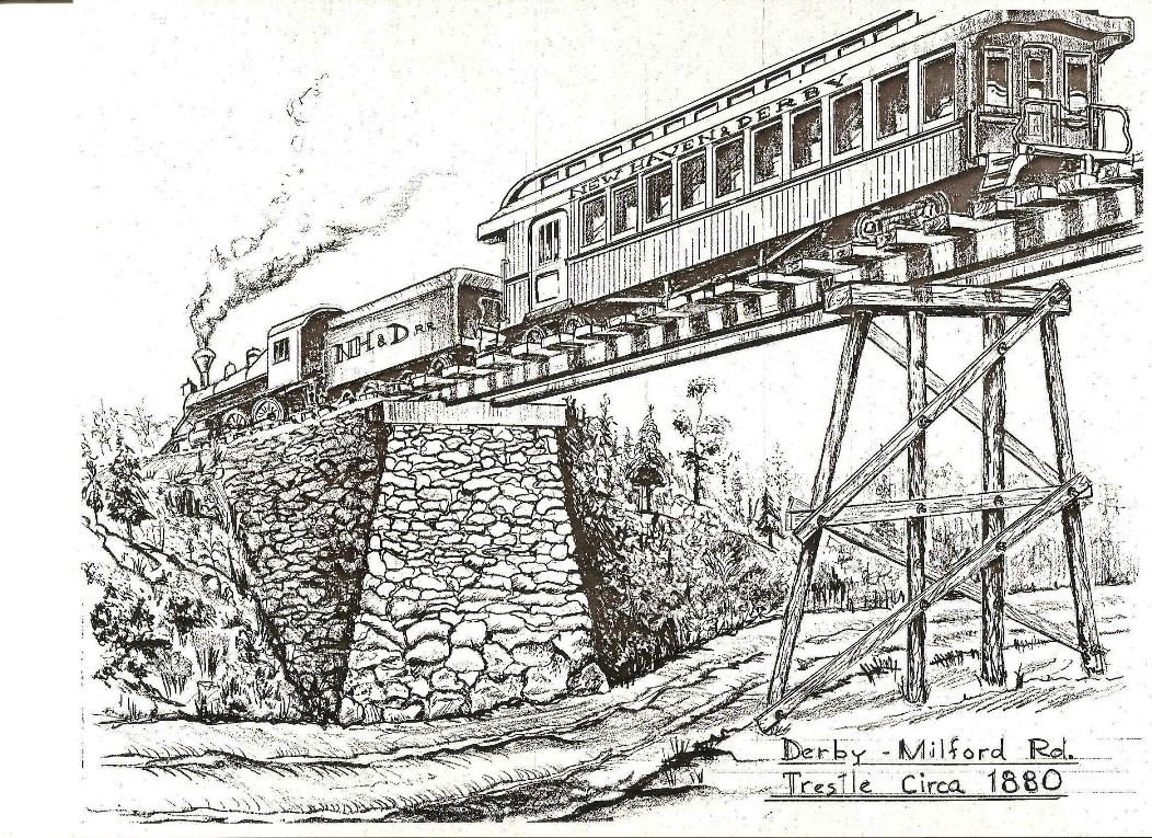 [4.55.1] The sketch at left is by an unknown artist and shows the second crossing of Derby-Milford Rd. What is interesting about this image is that the artist was either working from a photo or first-hand knowledge that the original construction approaching the abutment was on trestle. The ca. 1880 date is correct since we know that the trestle work was filled in 1883. At that time, the south abutment was built and presumably the northerly one was rebuilt or strengthened to match it. Other details, like the shape of the abutment and the lettering on the engine, are less accurate. The 1929 PUC photo at middle says it looks south but it is really facing west at this point. The north abutment towers over Derby-Milford Rd. pretty much today as it did over a century ago, though what appears to be the upward regrading of the pavement may have stolen a little of its stature. Coming upon this massive roadside monument still must elicit surprise and awe from passing motorists, as it first did to us many, many years ago and inspired the life-long pursuit of ferroequinology. One has to admire the determination of the NH&D to build with obstacles such as these.
