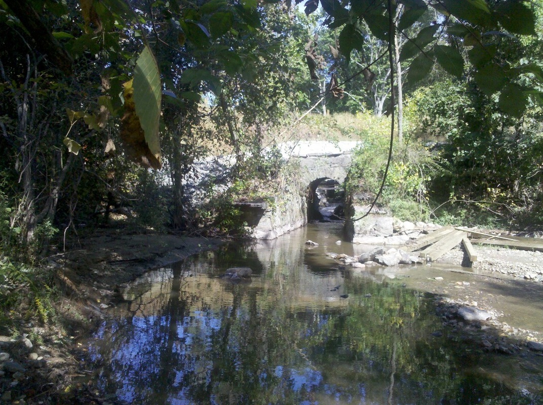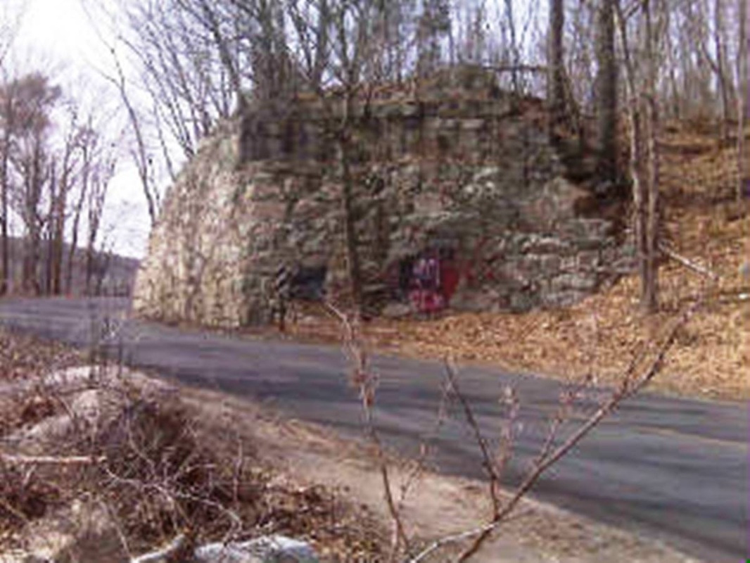 [4.55] If the north abutment isn't a treat enough, park your car off the road across from it and look around at what is left on the other side of the dismantled south abutment. This amazingly tall and well-preserved culvert still looms large with its keyhole-like facade. If you are looking for the light at the end of the tunnel, don't. It is pitch black because the other end is so much shorter and less conspicuous, along the road just a little further east [lower left photo]. The conduit under the embankment must have been 200 feet long, almost making the two facades seem like separate structures. The 300-ft long, 50-ft tall trestle was filled and the culvert to channel Davis Brook under the embankment was constructed in 1883. Hurricane Sandy in 2012 undermined the tunnel and necessitated repairs in 2013, jointly funded by FEMA and the Town of Orange. We argued strongly for saving this 130-year-old stone structure, which was patched from within, uncovered from the exterior and capped with cement. It seemed especially important to be proactive here in light of the Two Mile Brook structure which had largely been lost a few years earlier: see MP 4.56 below. [REFS: NHER/11/12/1883/02; CRC31.1884.17][rev051915]