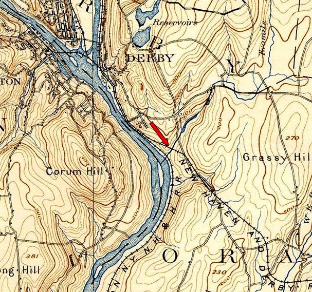 [4.56.1] This shot is from the southeast portion of the 1893 Derby quadrangle topographic map. Click here for a backward look at the NH&D route through the town of Orange just traversed on the southwest portion of the New Haven quadrangle. The steep westbound descent, just above the red arrow, is where Christopher Kelly and other passengers riding the first regular train from Ansonia to New Haven had to get out and push the consist up the grade back in 1871 [ES/07/17/1907/06]. The red arrow also marks where Two Mile Brook flows through the culvert in the photos above.