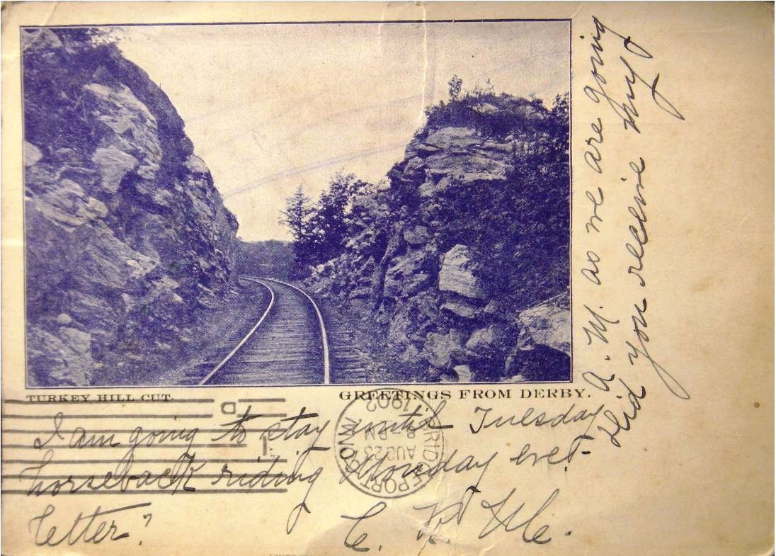[4.56.2] The item at left shows the same photo used on another card in addition to the one Charlie Dunn sent us some time [middle]. This new one is postmarked 8/23/1902. The 1896 Souvenir History of Derby and Shelton, Connecticut by Charles B. Gillespie, published by the Transcript Co., Derby, Conn., has the exact same image on page 5. The picture is captioned "THE CUT," N. Y., N. H. & H. R. R. This booklet also highlights businessmen of the time. One of these is Albert K. Kennedy, co-owner of the Transcript Co. whose Derby newspaper was the oldest in the lower Naugatuck Valley. The Kennedy Press, the printer shown on the address side of the new card, was probably a subsidiary operation, also perhaps located in the company's own building on Main Street which is pictured on page 34. Rob Novak, who is well versed in Valley history, is quite certain that the Kennedy confectionary store at Elizabeth and Sixth Sts. was a another family operation. He goes on to say that Albert, who died in 1918, represented Derby in the state legislature and that another presumed relation, James D. Kennedy, superintended the construction of the Ansonia, Derby & Birmingham electric freight line and witnessed the first running of the locomotive on May 17, 1888. See Track 4C, MP 4.66.2 for more on the AD&B. So much history from one image! It is interesting that this scene was thought to have so much sales potential, but as any collector will tell you, seemingly mundane, local railroad scenes and the plainest of structures were a staple of postcard publishing, especially in the first half of the last century.