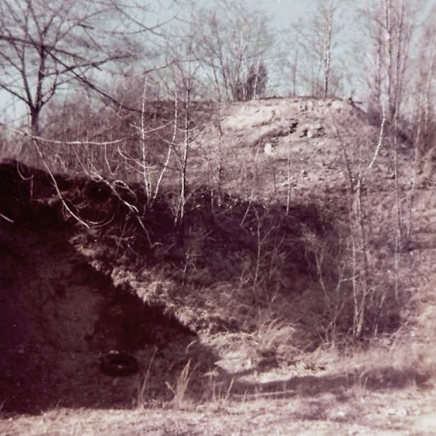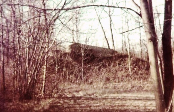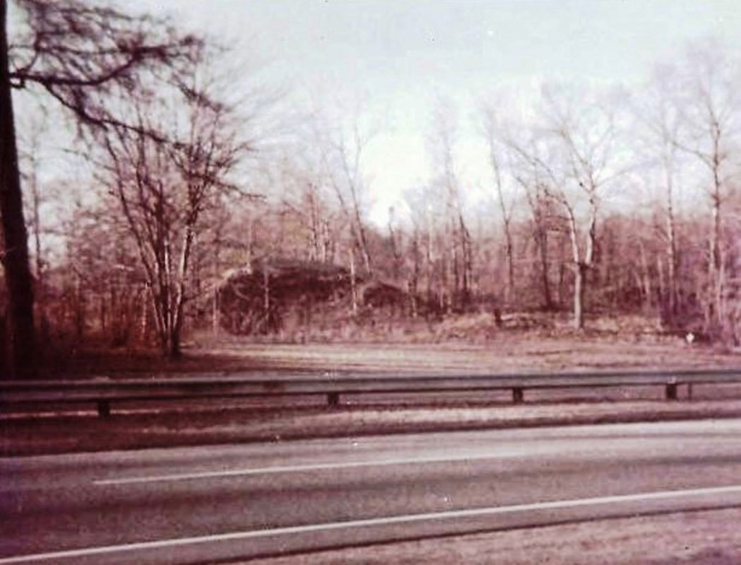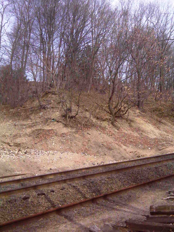 [4.55.8] This shot shows the open face of the NH&D embankment in 1980, northwest of Derby-Milford Rd and ahead of the crossing of Oil Mill Creek, now Two Mile Brook. The view shows how the right of way had been carved out then and by 2009 it had been further cut down almost to ground level.