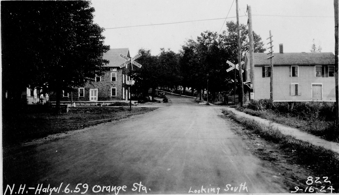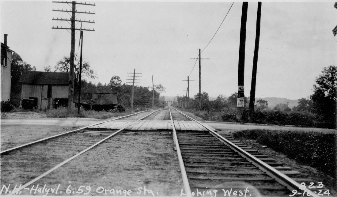 [4.47.3] The middle image looks south on Orange Center Rd. in 1924 and shows the Scobie store on the right and the Woodruff seed warehouses on the left. If you look closely at the edge of the station on the left side of the shot, you can see that it is not yet the firehouse as of this 9/16/1924 photograph. The doors and windows are unaltered and there appears to be a young boy on the platform. The left photo shows the Orange Center station as the volunteer fire department in 1927. This transformation came about later in 1925 after passenger service ended on June 25. The platform has been removed and it looks like the driveway has been built up to the level of the newly installed garage door. At the risk of brightening this picture excessively, we tried to illuminate the box cars sitting on the siding that served the warehouses. The photo at right is the view west from Orange Center Rd., with the runaround track for the station looking already disconnected at the switch. The Ridge Rd. overpass is visible farther down the line. We also cannot help but notice the several telephone poles on the left (south) side of the track with five crossarms close to the ground and holding 10 or so wires and glass insulators each. Could these be for the SNET Orange telephone customers? This crossing was the only one in Orange busy enough in 1910 for the railroad commissioners [RRC 23: 200; see also MP 4.41.3, above] to order an attendant and a sign saying "Flagman On Duty for Express and Through Trains Only," a posting that the railroad's "chief engineer" suggested in 1918 should be replaced "by one in conformity with present standards" [Dkt. 2963]. This probably means that no Pittsfield-bound through trains were using this line any longer and also that all remaining local trains stopped here as well, thus eliminating the need for a flagman.