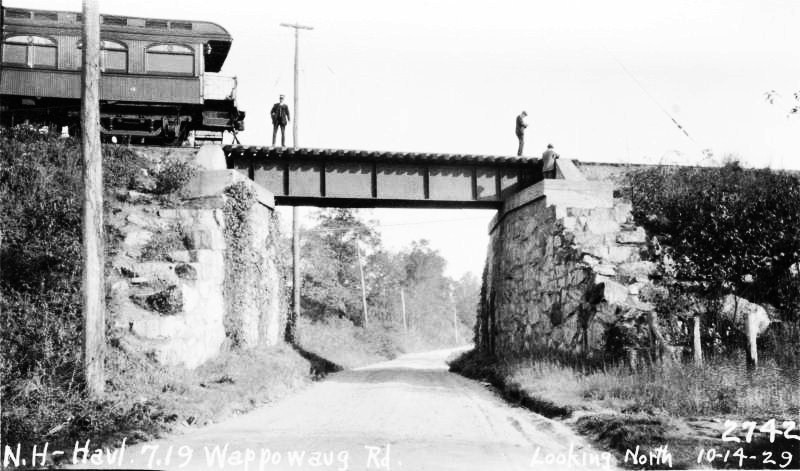 [4.50] This shot is of the NH&D bridge over what is now Grassy Hill Rd., CT Rte. 121. The writing on the bottom of this photo identifies as mile point 7.19 in 1929 at Wappowaug Rd., named for what is more commonly spelled as the Wepawaug River. The short distance between the Orange Rd. undercrossing and this overpass shows the start of a westward climb on the old NH&D. The business car, seen in use in the 10/14/1929 inspection photos and also elsewhere on Track 4B, was NYNH&H No. 4, ex-400, pictured in the Shoreliner [SL26.1.26,32].