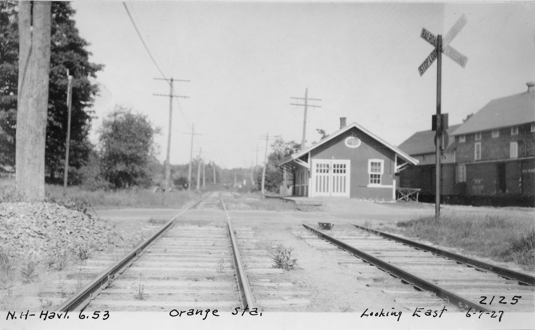 [4.46.3] The Orange station was on Orange Center Rd. where the small shopping center is now. The view looks east. The station was built with $1003 in local funds and presented to the NH&D in a manner somewhat similar to the Tyler City station and relatively common at the time when communities wanted to guarantee that the train would stop in town. Ground was broken early in September of 1871 [NHDP/09/07/1871/01]. According to notes left by the late Harry Grillo, long-time resident and history buff, it was finished within the month, as stated in the newspapers to coincide with the annual Orange Agricultural Fair. Sidney F. Oviatt moved the post office from his house across the town green to the station [see Track 2, MP 2.2.4]. Oviatt, who served as postmaster and station agent until 1887 - he died in 1894 - is likely seen on the platform. A newspaper article in 1877 reported that there was a cannon on carriage wheels opposite the railroad station, complete with rammer and sponge and a placard saying "Don't strike here" [NHER/08/01/1877/04]. The article does not say whether the cannon was aimed at the station!