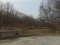 [4.55.2] The NH&D ran on the elevated ledge seen in the middle of the shot on the left. The right of way is pretty much undisturbed in this area from the north abutment just visited. This is on your right as you are driving toward Derby. Our eyes could be deceiving us but the grayish matter to the left may be cinders left from days long gone. The third crossing of Derby-Milford Rd. was up ahead at the 964 address where the track was on a diagonal, heading for Derby Jct. at a point known as Tynan's crossing. Rails were still sticking out of the pavement there back in the late 1970s. The middle photo looks back toward the north abutment and the shot at right looks out from the abutment to Derby-Milford Rd. below.