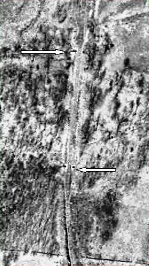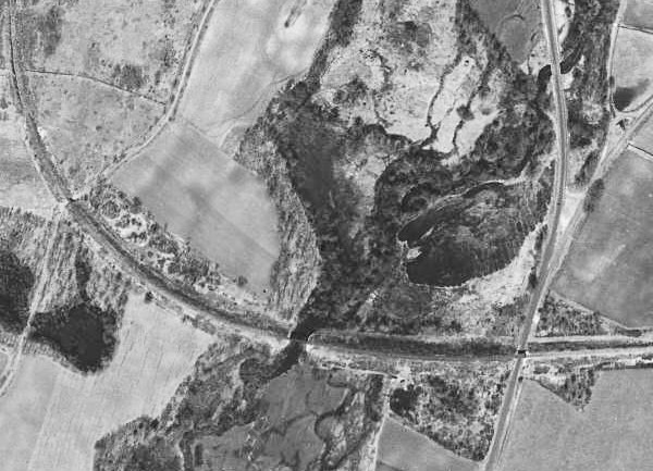 [4.52] The Derby line turns almost due north through Orange's rural fields at this point. Vestiges of the town's farming heritage can be seen in the two cattle bridges at the arrows in this scan of the area below Turkey Hill Rd. which is seen running across the bottom of this shot. Even in 1934 these bridges were probably in use for the passage of livestock in this community with very strong agricultural roots. These cattle bridges are still in existence today between the Wilbur Cross Pkwy and Turkey Hill Rd.