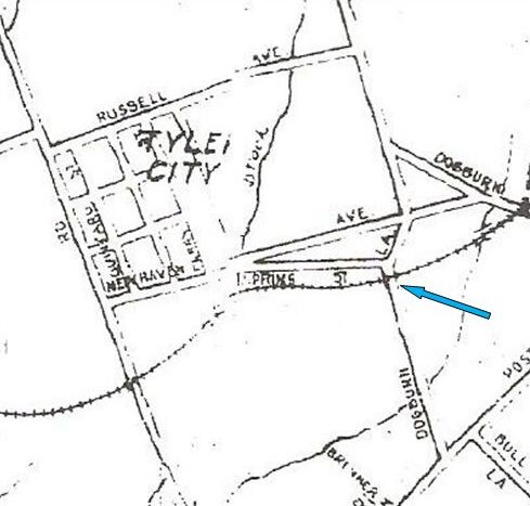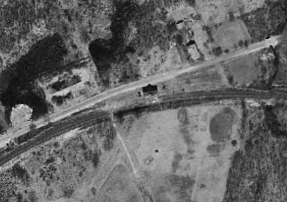 [4.43] The Tyler City station is clearly still standing in March of 1934, the aerial outline matching its photo. The building over to its right on the north side of New Haven Ave. is the general store and post office. A few homes just to the west are out of sight here but the visionary Tyler City is undeveloped otherwise. The large rectangle, west of both the station and the remnants of Harrison Ave., is the footprint of the factory building built by Samuel Halliwell, one of the 'proprietors' of Tyler City.