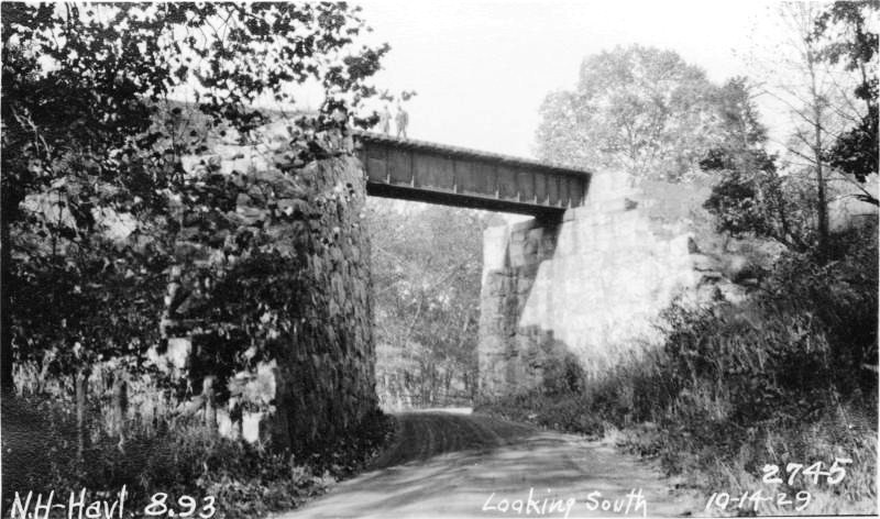 [4.51] This photo is of the NH&D bridge over Cranberry Lane that went west off Grassy Hill Rd. right where the Wilbur Cross Pkwy was built in 1941. This is mile point 7.57 in the 1929 photo. A short dead-end piece of this old road still exists off the southbound entrance ramp.