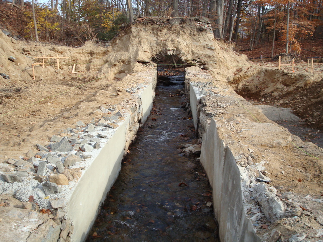 [4.56] The remains of what was once an extensive culvert with twin portals and a 140-ft channel stands west of Derby-Milford Rd. at the base of what was still a high, filled embankment in the 1980s when we began this research. The culvert carried Oil Mill Creek under the railroad. The NH&D was not built on trestle here, as we have learned from recent excavation work, so this culvert complex must have dated to 1870 or 1871. The shot on the upper left was taken on March 28, 2009. The upper middle photo is a look toward the interior of the east portal, now gone, with the arched underground aqueduct, some of which had collapsed [click here], dismantled. Due to fish-spawning considerations in the pool in the foreground, further work here was curtailed and the arch was not taken off the top of the west portal as had been planned. While intended to maximize water flow in the worst-storm case scenario, that decapitation would have robbed this historic structure of any remaining aesthetic charm. Instead, an overflow channel on the north side was created to handle whatever the old portal could not. At upper right is an eastward-looking view of the new culvert behind the west portal. At lower left are two shots of the remaining structure. The photo at lower right looks southeast back toward Derby-Milford Rd., with the white house in the distance marking Tynan's grade crossing. While we would like to think that our involvement helped to bring this rescue about, we are grateful in any case to Mount St. Peter Cemetery and the wetlands commissions of both Derby and Orange for their consideration of an alternative plan that makes both the frolicking fish and the fastidious ferroequinologist (read iron-horse-ologist) happy. It is unfortunate when the relics of the past must be bulldozed, but this is a victory with what we have been able to preserve of this historic railroad.