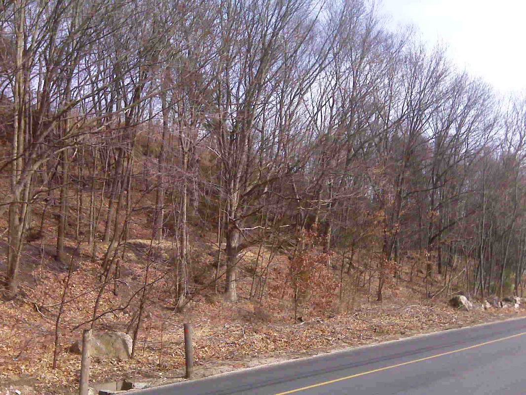 [4.56.3] This is a south-facing shot looking back toward the Derby cut. The height clearly shows the eastbound grade, perhaps 50 feet in a half-mile, likely the most challenging on the Derby line. No wonder Christopher Kelly and his fellow passengers had to push the first train from Ansonia up this incline on August 9, 1871 [AES/07/17/1907/06]. Stalled engines at Turkey Hill would be a periodic occurrence until the NH&D acquired more powerful locomotives. Down to the right is the NRR track at river level. Dark patches of dirt or cinder ballast are still seen here on the right of way forty years after the line was torn up.