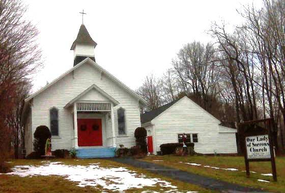 [4.41.7] The building on the left, Our Lady of Sorrows Church at 378 Spring St., is the 1874 Tyler City schoolhouse. It was decommissioned in 1909 and remodeled by successive church groups for ecclesiastical purposes. This has meant the addition of the two narrow windows on the south side seen here, the construction of a lower profile sanctuary area on the north end, and the installation of stained glass windows throughout. This location is just east of the site of the Tyler City railroad station where classes were first held in 1873. The track ran on the south side of Spring St., just behind where the photographer is standing in the photo at left.
