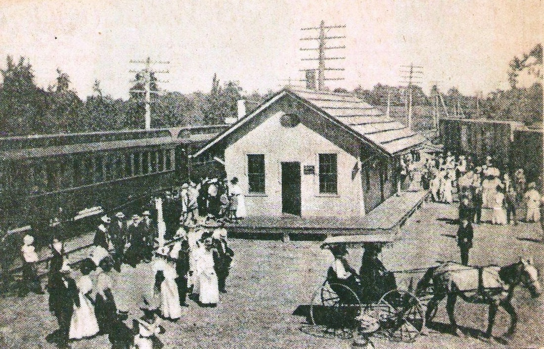 [4.42] This is the 1872 Tyler City station that stood along New Haven Ave. in Orange. It was built by Philander Ferry and Samuel Halliwell, promoters of the visionary railroad boom town, and given to the railroad on condition that trains stop here. In contradiction to many chroniclers, timetables show that trains stopped here regularly until 1877 when, perhaps because the vision was fading, Tyler City became a flag stop, but, even then, one morning and one evening train stopped here regularly [NHJC/06/04/1877/02]. More frequent regular service returned in the 1880s and 1890s. The station burned on July 4, 1936, the victim of holiday revelry, perhaps not altogether unlike New Haven's Austin depot that was destroyed by fire in 1894: see Track 6, MP 6.7.