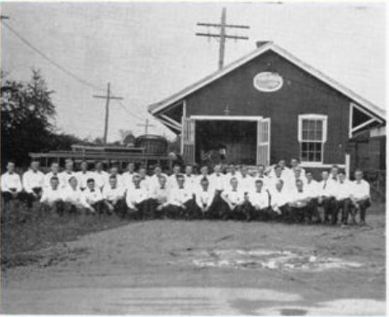 [4.47.1] Another view of the Orange station, looking east toward Tyler City and New Haven, ca. 1908. This amount of activity at the station probably indicates a special event, perhaps the Orange Fair, an annual event that went back at least to 1871 when the NH&D opened. Mary Woodruff [p. 122; see Track 1] says the fairs, with dwindling attendance, lasted until a final one was held at Savin Rock in West Haven in 1916. An Orange Country Fair was reinstituted in 1975 and is once again a celebrated annual event. The cars on the sidingto the right show some pretty active freight business at that time as well.