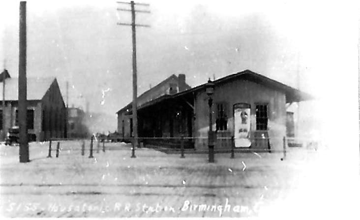 [4.63] Based on Oakley Hoopes Bailey's celebrated reliability, this sketch of the Birmingham station is probably quite accurate. Click here for the full 1876 map. This station stood west of the track at the northeast corner of Foundry and Second Streets, the latter of which would later become Main St. Notice how the ornate office building above 'Foundry' in this shot matches the one in the advertisement just above. Rockey [2:377] says the Birmingham station opened in March of 1872, but the Journal says it was nearing completion in December of 1871 [NHJC/12/15/1871/02]. It was largely paid for and "owned principally" by William E. Downes, who would be on the NH&D board of directors from 1882 to 1889. The importance of this stop to local industry is seen in reports like the one that said a thousand tons of scrap metal was unloaded here for use at BIF late in 1879 [NHER/12/16/1879/01]. The original combination station was "practically ruined" in a serious fire, arson suspected, on 06/30/1879. [NHER/06/30/1879/04; NHDP/07/01/1879/04; NHER/08/01/1879 /04]. The cost of the new depot was reported [CRC26.1879.186] to be $4544.01. In 1884, the platform was relaid with chestnut planking [NHER/06/02/1884/04].