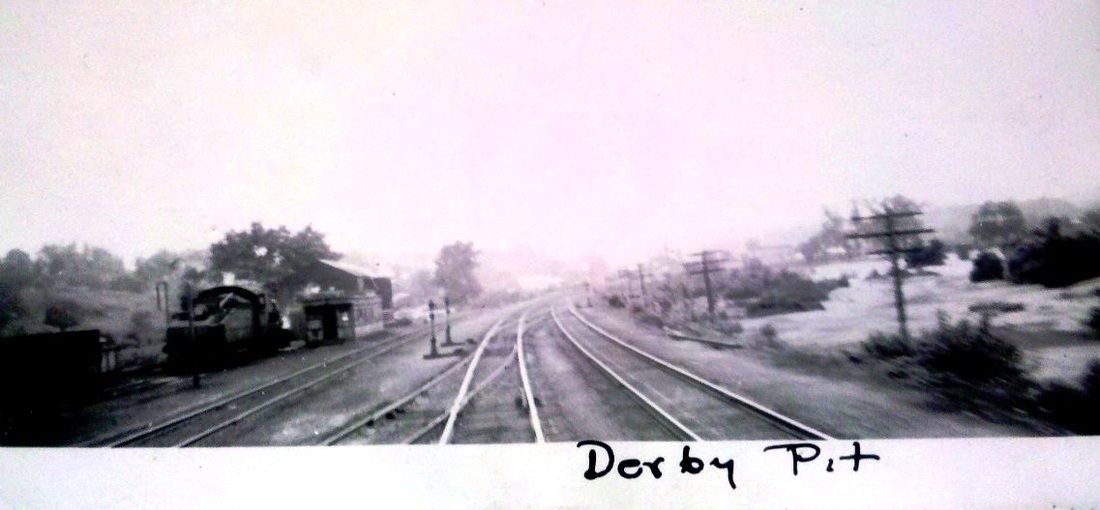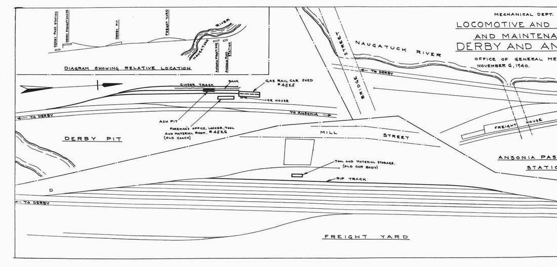 [4.64.3] The photo at left is a northerly look at the Derby Pit area on the west side of the Naugatuck line and so named either for the ash pit or the maintenance facility located here. The item at center is a 1940 map of the layout from the NHRHTA's reprint of a volume entitled New Haven Railroad - Mechanical Department Facilities Maps. The photo on the right is a westerly view and has 'Derby Bus Garage' written on the left side margin. The large engine house-like structure was apparently used to store and service the new Mack railbuses. An old coach was set up as a foreman's office and a locker, tool, and supply room for a crew to work on these new vehicles. Railbus service did last into the 1930s elsewhere and this 7/22/1929 photo likely indicates that servicing was done at this facility for some time after Derby line railbuses ran no more.