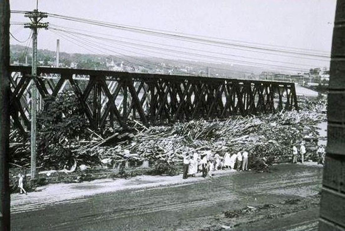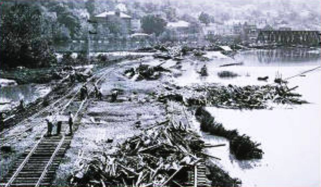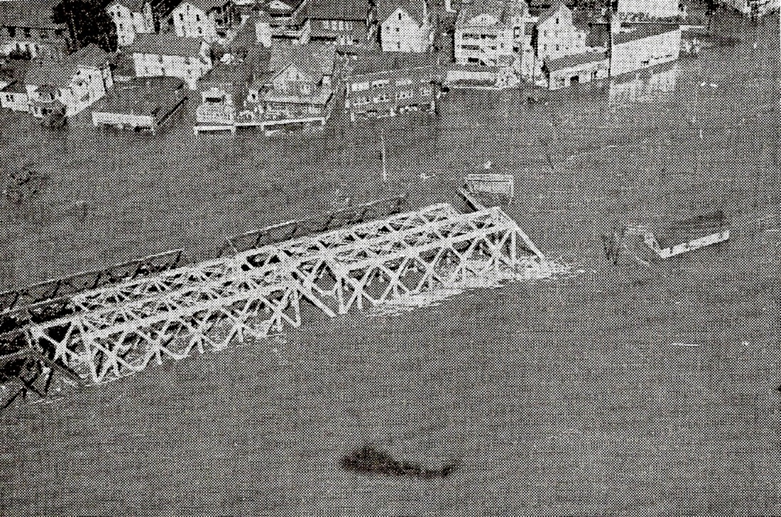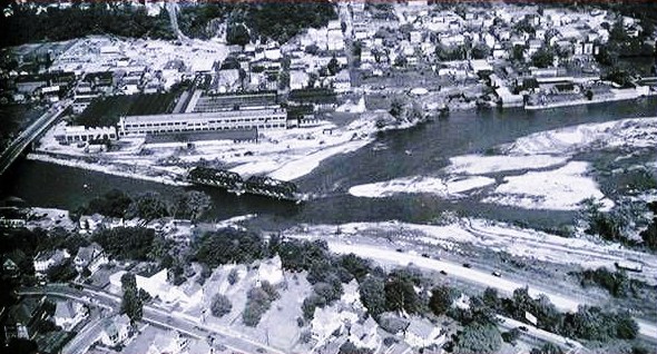 [4.83] This shows the scene after the flood of August, 1955, the passenger station being at the blue arrow and the freight depot at the red arrow. The newspaper reported that the flood tore the entire depot off the brick piles on which it stood "so that the platform and roof were bent and twisted like a toy." The railroad lost no time in announcing that the freight depot would not be rebuilt and that operations would be moved to Derby [ES/0826/1955/04]. The fact that it sat astride the old canal's tail race, which still served as a channel for storm runoff, probably did not help. The building was cut in half to free up the debris, the sight of which was described by U.S. Senator Prescott Bush as "the most horrible thing he has ever seen" [ES/09/06/1955/07]. In addition to the ugliness, the backed-up water was preventing the flooded streets from draining. Firemen watched over a funeral pyre as the remnants of the structure were burned to clear the area. [ES/09/20/1955/05; 09/23/1955/03]. Click here for more on the old canal and tail race.