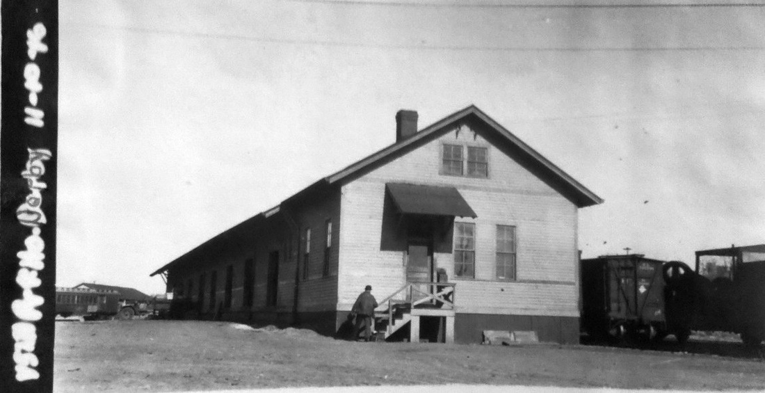 [4.64.1] The val photo at [1] is dated 11/10/1916 and shows the west side of the freight depot; there is a passenger car on the siding in the distance. J.J. Harness took additional valuation photos later. The 5/13/1931 view at [2] is similar to the preceding one and shows the side of the building where freight was transferred to wagons and trucks for local delivery. The view at [3] shows the east side of the building where rail cars on the siding were unloaded. [rev033115]