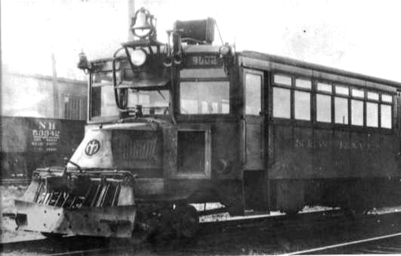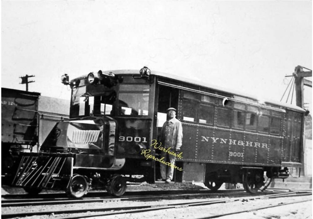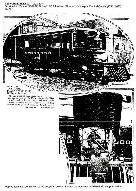 [4.64.2] The Derby line was to play host to new technology in 1922. An article in February issue of Railway & Locomotive Engineering that year, ran thusly: "The New Haven Introduces a Gasoline Car. A gasoline driven car, the first of its kind that has been put in operation on the New York, New Haven & Hartford Railroad, and known as No. 9000, has been placed in operation on the Derby division between Ansonia and New Haven, where the runs are short and the traffic not heavy. It is a combination of railroad car and automobile. In its initial trial trip it ran at a speed of thirty-five miles an hour. The car is twenty-eight feet long and a trifle over nine feet wide, and seats thirty-five people. Four feet of its length are reserved for baggage. The motor is the same as that used in a Mack truck, and can develop sixty horsepower. The total weight of the car when fully loaded is estimated at 20,000 pounds. Only two men will be needed to operate it—the driver and a man to act as baggage man and conductor—and it is understood that if it proves a success others of the same type will be put in service on other short runs of the system." Photos of the 9000, 9001, and 9002 are at top and the Courant announcement of the new equipment is at lower left. It is no coincidence that the railbus debuted here. The NH&D line had become something of a poster-child for ridership lost to CR&L trolley competition beginning on 12/12/1903. This attempt to cut costs and stave off the abandonment of passenger service here lasted only until June, 1925. [REFS: HC/01/08/1922/A5; RLE35.1.47 (2/1922)][rev040715]