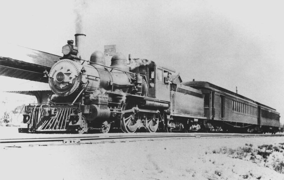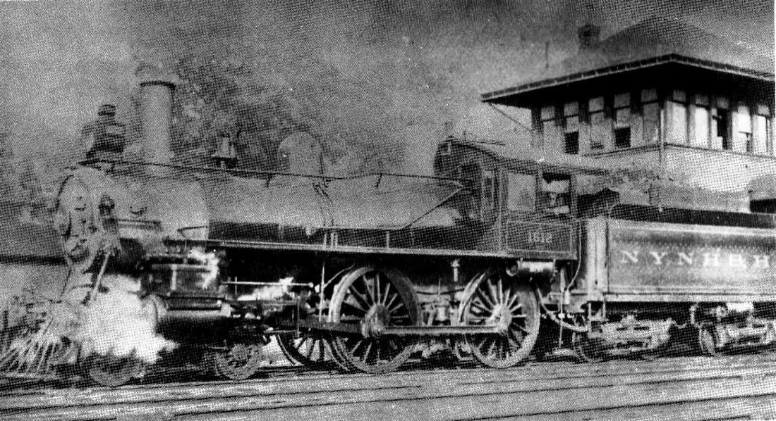 [4.63.6] This is a shot of #1413, a Class B-3, 4-4-0 unit built by Rogers in 1892, with 19x24-inch cylinders and 68-inch drivers. This was formerly HRR #56, and was renumbered into the NYNH&H roster in 1892 as #506. You can see the southern edge of the Derby passenger station and canopy to the left of the engine, which is headed toward Derby Jct. The two-car consist looks like one of the Ansonia locals that was the legacy of the NH&D. The date is sometime after the 1904 renumbering that made this engine the #1413 and 1920 when the ICC required electric headlights on all locomotives. Based all the evidence, the feeling is that this is ca. 1915. This engine was scrapped on August 31, 1925, the year in which Derby local passenger service was 'scrapped' as well.