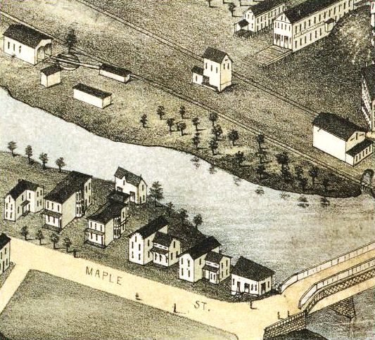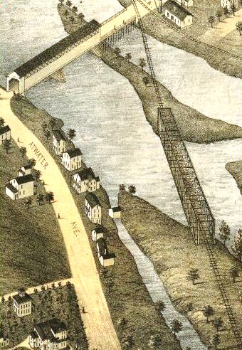 [4.59.01] This is from the Bailey 1875 bird's-eye map of Ansonia. See below at MP 4.65. This is the original bridge, a wooden truss structure, at the NH&D's upper crossing of the Naugatuck River into Ansonia. The bridge here at Derby Jct. was presumably similar. Upgraded bridges at both places installed in 1880 were also wooden structures but covered for protection from the elements [CRC26.1879.25; CRC28.1881.15]. The contract for a new iron bridge at Derby Jct. was awarded to Murray, Dougal and Co. of Milton, PA, with a price tag of $5,065 [NHER/05/09/1879/04; NHDP/05/10/1879/04; NHER/05/12/1879/04] but the builder reneged owing to a steep rise in the cost of iron [NHDP/04/26/1880/04]. The 205-ft bridge here was constructed instead by A.D. Briggs & Co. of Springfield at a cost of about $4,300 [NHJC/11/10/1879/02; NHER/11/17/1879/01]. A temporary trestle was put up so trains could bypass the work on this new bridge, which was finished mid-April, 1880 [DTR/02/20/1880/03; DTR/04/16/1880/03]. Briggs likely also put up the new one at Ansonia. It is not known whether there were any iron components at all in these bridges but wood and iron bridges did exist. Murray, Dougal was known more for building railroad cars than bridges and became one of the companies that merged in 1899 to form American Car and Foundry [click here].