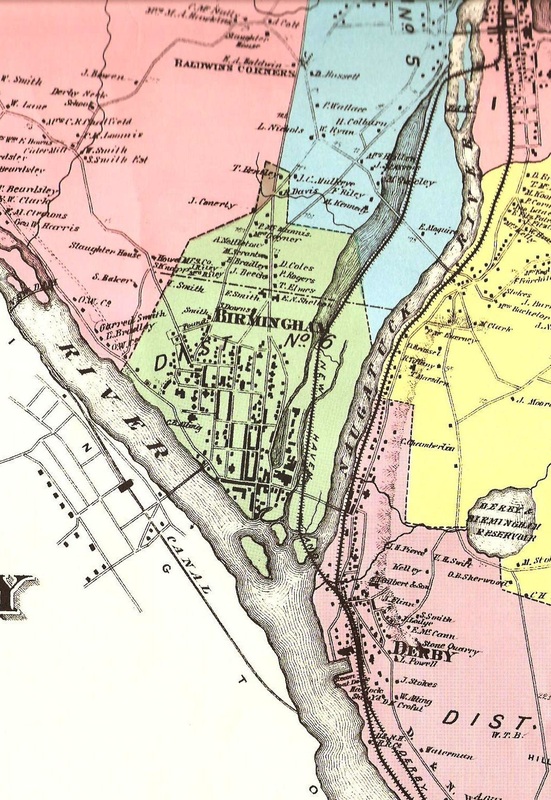 [4.59.1] This is a close-up of the Derby map from the 1868 Beers atlas of New Haven County and has to be used with caution. While it shows NH&D complete all the way to Ansonia, the portion from Derby Jct., only added to the plans in 1868, is the projected route. The right-angled crossing of the river into Ansonia is not the diagonal crossing that was actually built. The Shelton canal and Ousatonic Dam (extreme left), both of which only opened in 1870, are also seen. The NRR, operational for some 20 years already, is shown with the safer route it chose on the east side of the Naugatuck River. The NH&D route here would be largely on trestle at the start through the flood plain, called 'the flats' or 'the meadows.' In this low-lying area, nevertheless, there were once several residences now reduced to one house seen on the map above on Old Town Rd., a trotting park [NHER/01/23/1891/01], and a cave where 'brigands' hid out until an NH&D engineer reported them [NHER/11/30/1884/01; 12/01/1884/04]. This was a precarious balancing act for a fledgling railroad that was determined to serve Birmingham and Ansonia through the repeated floods that the river has always been noted for. Also seen are the extensive waters of the Birmingham canal, west of the river and wider than it at some points, that went right down into the center of the borough to power the industries there. The Birmingham Water Co. dam that diverted flow into the canal can be seen as the line across the river below the NH&D crossing on this and other maps. The lower channel into the canal is not seen here but is shown on the map at MP 4.71.1 below.