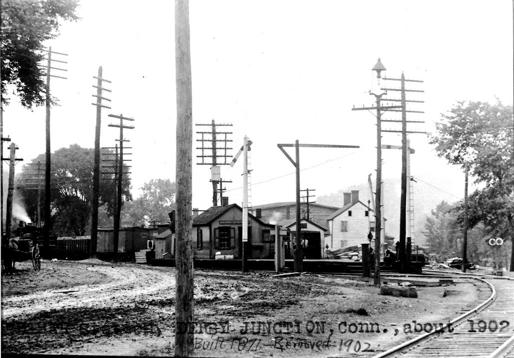 [4.57] The images at left and center look south toward Derby Jct., the latter being in 1902 and just prior to the removal of the depot. The 1871 build date, however, is not correct. This depot goes back to 1880 when a pooling agreement between the NRR and NH&D went into effect, at which time an interchange track was added as well as a 40x65-ft plank platform between the two railroads, and the "shanty" from 1871 was pushed "down the track some rods." The long-sought trade treaty caused the Derby Transcript to intone "Peace henceforth all along our borders" in January, 1880. The economic detente resulted in a 15% increase in NH&D receipts in the first month and cooperation thereafter resulted in the use of each other's tracks from Derby Jct. to Ansonia in times of need. In August of 1880, while the NH&D's trestle across the meadows was being refurbished and possibly the new covered bridge into Ansonia was being installed, the NH&D used the NRR track from Ansonia and passengers bought tickets and accessed NH&D trains at the NRR's (East) Derby station. While there was no accusation of collusion, both roads were chided in 1884 for charging the same 10-cent rate for the two-mile ride from Ansonia to either Birmingham or Derby, seen as excessive compared with two or three cents per mile charged by railroads elsewhere. The NRR dropped its fare to a nickel but the Derby, for the moment, did not follow suit. Rate complaints would be among the reasons for building the Ansonia, Derby & Birmingham RR in 1887. See below at MP 4.66.2. The covered waiting shed seen to the right of the station was added in 1886 to shelter passengers and baggage in bad weather. With the coming of the new NRR passenger and freight stations at Ansonia in early 1887, the newspaper also said that future transfers of cars would probably take place there and not at Derby Jct. There is evidence to suggest transfers took place at both locations over the years, with the June, 1879 timetable at right clearly showing through cars via Birmingham on the NH&D and handed over to the NRR at Ansonia for passengers travelling north. An 1882 article in the Register says that "in switching the rear car on to the Naugatuck track, the brake by some means got loose and followed in on the Derby track, striking the rear car with considerable force, breaking the bumpers and giving a general shake up to the passengers." The NH&D had complained on several occasions about these delays at Derby Jct. What these arrangements were for the exchange of freight and passengers here and how through cars were handled over the years is still not fully understood. [REFS: NHER/02/06/1879/04; NHER/03/07/1879/04; DTR/01/30/1880/03; DTR/02/06/1880/03; NHER/02/19/1880/04; DTR/02/20/1880/03; DTR/04/09/1880/02; NHER/08/21/1880/04; NHER/10/17/1882/04; NHER/03/27/1884/02,04; NHER/03/28/1884/01; NHER/11/17/1880/01; NHER/04/25/1884/02; NHER/11/30/1884/01; NHDP/01/25/1886 /03: new waiting room added; NHDP/04/03/1886/03; NHER/01/14/1887/02; NHWP/01/19/1887/04][rev011414]