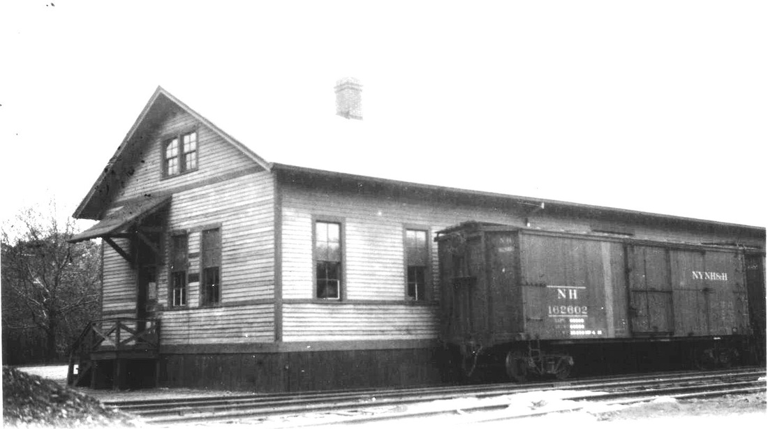 [4.67] The view on the left shows the 1887 passenger station as well as the ca. 1884 freight house. The one on the right is a post card, probably ca. 1900. The freight house has been noticeably lengthened, perhaps subsequent to the 1887 lease of the NRR by the Consolidated. The NRR track runs behind it. It does not seem like the double-tracking, completed by mid-1904 to a mile or so north of Ansonia, is in yet, but it is hard to tell. This view is from Bridge St. just above the NH&D bridge over the Naugatuck River, which, since 1880, has been the covered bridge seen in the next photo.