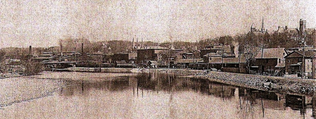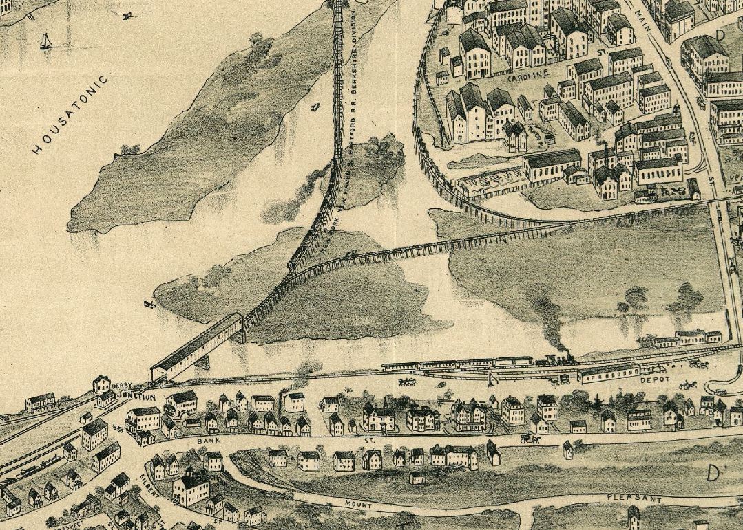 [4.60] The image at left is from the 1898 Landis and Hughes bird's-eye map [click here]. The 1880 NH&D depot is in the lower left and the NRR's 1848 Derby depot is at the lower right. The 1880 covered bridge is also seen. The Extension now diverges west on Hog Island. Note also the curved riverfront trestle that was put in to serve the Alling, aka Paugassett, Mills and the Bassett Co. When the Extension was being laid out, these important Birmingham apparel-makers wanted it to be on their side of the Housatonic to better serve them and not make Shelton more competitive. While some Sheltonites resisted the railroad for other reasons [see Track 5, MP 5.5], the spur was enough to make the mill owners drop their opposition [NHER/07/18/1888/01; RRC23.108 (5/18/1889)]. The view is largely replicated in the CHS photograph to the right.