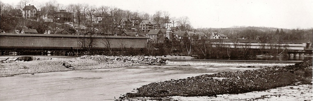[4.68] In another rare photograph, we have a view of the covered bridge that the NH&D built in 1880 to replace the wooden truss bridge seen above at MP 4.65.2. The new bridge had iron support elements and possibly an iron deck as well. The structure, however, was primarily wooden and thus covered for protection from the elements. Compare this bridge to what is seen on the bird's-eye map at MP 4.60 for Derby Jct. This bridge burned on 6/10/1902 [HC/06/11/1902/13] and 70 trains per day were said to be using the NRR's track on the east side of the Naugatuck River until the bridge was replaced in the 1903 double-tracking. The photo also gives a clear picture of the Birmingham Water Co. dam, which spanned the Naugatuck in two sections and diverted flow into the canal. Seen in the background is the half-covered Bridge St. bridge linking east and west Ansonia. The bird's-eye map at right shows the covered railroad bridge at the red arrow, but the captioning in the Images of America Ansonia book [p53] ascribes the bridge to the NRR instead of the NH&D.