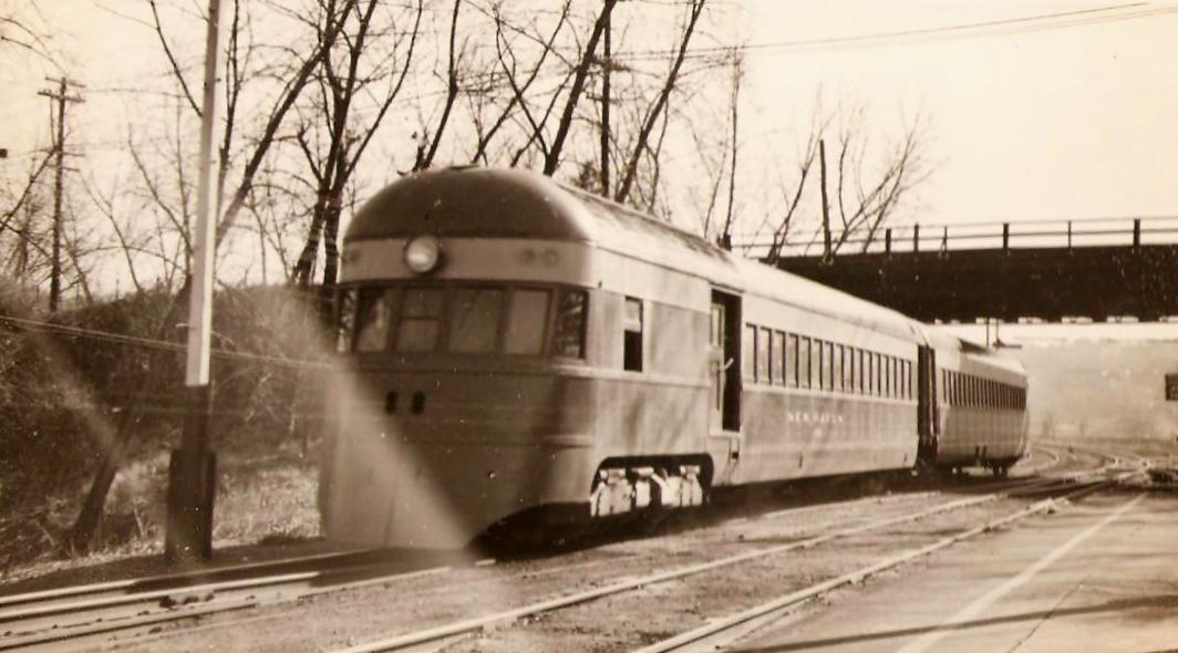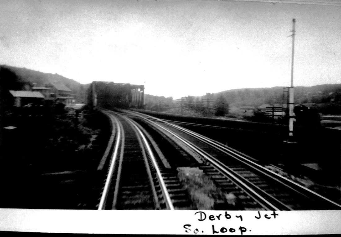 [4.61.7] The first two shots look back at the area called the Derby Loop, with the wye track to the right going toward Shelton and Maybrook that allowed trains to avoid the heavy NY&NE grades between Hawleyville and Hartford. The loop track was put into service on 7/11/1917: "This morning's freight traffic over the "Y" which connects the Berkshire tracks with the Naugatuck division was very heavy and observers are now convinced that the company has substituted the Derby route for the Hawleyville route for freight from Poughkeepsie Bridge destined for points east. Four heavy freights passed through in quick succession this morning. For some time past freight has been accumulating at the company's large yards at Maybrook, N.Y., and since the Berkshire and Naugatuck lines have been connected between Derby junction and the Derby station the company has been sending all the trains that it's available engines and crews will permit." The photo at lower left shows the Besler steam train approaching Derby station on 11/11/1936. This is train 456 operating from Bridgeport to Waterbury, according to information on the back of the photo. The post card at lower right shows the train heading back to Bridgeport. The two-unit, air-conditioned streamliner was 163 feet long and had seats for 152 passengers. It first ran test runs from New Haven to Bridgeport, then up to Waterbury and Hartford and back to the Elm City on 8/19/1936. [REFS: HC/07/14/1917/08, quoting AES/07/11/1917/00; HC/08/19/1936/03; B16]