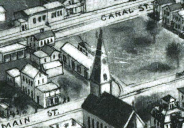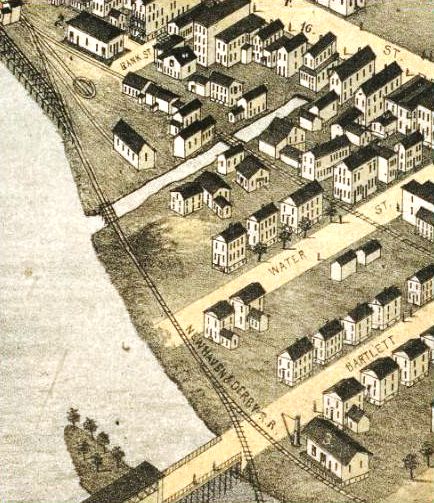 [4.65.3] This shot and the one below are also from the 1875 Bailey bird's-eye map. The appearance of a connection between the NH&D and the NRR at the passenger station may be one of those rare instances of carelessness by a bird's-eye artist. If a physical track connection was in place, it certainly was not used for the transfer of freight, a complaint of the NH&D [NHDP/03/08/1879/04] that was not addressed until the 1880 joint pooling agreement. The structure just below Bartlett St., also known as Bridge St. and so-named sometime after March, 1884 [NHER/03/06/1884/04], is identified in the map key as the NH&D station, which we know was for freight and was appropriately located on a spur track. It opened in December of 1871 [NHDP/12/09/1871/02] with a "switch track... to the lower wire mill" also being put in at this time. A John Morrissy was night watchman for the NH&D in Ansonia in early 1884 [NHER/03/14/1884/01]. Note the strategic placement of the pillar crane by the street enable it to hoist cargo from freight cars to wagons or the depot platform. The crane was likely made by the Farrel Foundry and Machine Company right here in Ansonia, similar to the one covered in the Scientific American issue of March 24, 1883. Click here. The Connecticut Eastern Railroad Museum recently moved a crane of this type from Middletown to Willimantic. Click here. The NRR station at Bank St. (top left) is the original one that was shared and used by passengers taking trains on both roads. James Montgomery Bailey, the famed 'The Danbury News Man,' rode through here in 1873 and had a few interesting things to say. He noted "a formidable line of huge cannon" at the Ansonia station, probably relics of the recently concluded Civil War in which he served. He says these were "condemned pieces brought here to be melted into less frightful forms" by a "brass company in Ansonia that employs six million dollars in capital, and would use more if it was to be got," probably referring to the Anson Phelps companies. Subscribing to less flattering views of the NH&D, he says... "Here the Derby railroad terminates its weary self. The intricate history of this route, if properly placed before a dead man, would make him squirm. If he didn't squirm, it would be on account of ill-health"(!). The exclamation point is ours. Mr. Bailey was known for his acerbic wit; he took the NRR from Bridgeport for his tour of the Valley.