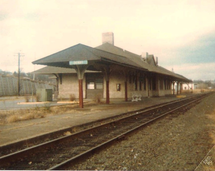 [4.64] The top left photo is from 1980 and shows just 'Derby' on the station sign. The other two views are of the station labeled Derby-Shelton station on March 21, 2009. Rte. 8 passes almost overhead and just to the west. The venerable structure looks quite sharp for having survived fire and flood. Even its signature porte cochere is still intact. Today the station serves as headquarters for the Valley Council of Governments covering Ansonia, Derby, Seymour and Shelton. The Valley Transit District operates from the building in the background in the shot at right. Along with CT Transit, it provides local bus service that stops here for passengers using the Metro-North Waterbury line. The transit garage sits on the site of the Derby freight house.