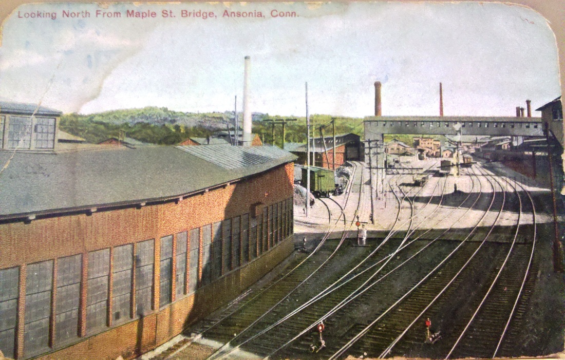 [4.66] The end of the NH&D line was above the Maple St. bridge in an area that was already heavily industrialized in 1871 and would become more so in the next decades. The freight traffic to and from here was undoubtedly the reason for extending the line to Ansonia in the first place. The bird's-eye map at [1] shows the two-stall Derby engine house and turntable in Wallace's Grove, apparently on land identified with the industrialist Wallace family. The woodcut at [2] shows an additional view of the property and the engine house. The turntable was in place early on to head NH&D engines back toward New Haven [DTR/08/11/1871/02]. The NRR track is to the right and continues on to points north. As late as January of 1891, Pres. Stevenson spoke of extending the NH&D by a third crossing of the Naugatuck River here where the newspaper said "extensive side tracks for freight and a new turning table are building" to accommodate the increased business after the HRR lease [NHER/01/06/1891/01; HRRAR 1890, p.5]. At the height of its succcess, there was talk of extending the NH&D all the way to Union City and Waterbury to compete for the vast amounts of industrial production the NRR, now leased by the NYNH&H, had always profited from. The factory area north of Maple St. would come to be the home of the massive Farrel complex. Heavy dependence on rail freight service, shown here perhaps ca. 1920, shows in the trackage, much of which is still in the ground today. As Metro-North rolls through here, staccato horn blasts for the empty crossings echo eerily off the walls of the buildings that are mostly vacant.