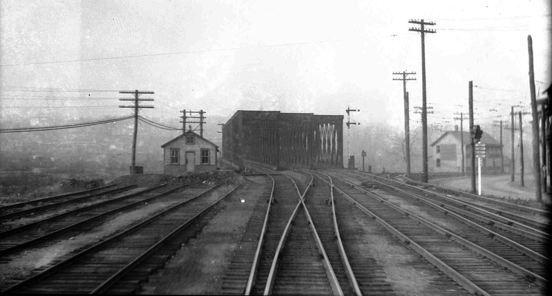 [4.61.1] At left, SS B-253, Derby Jct. tower, in a valuation photo taken by J.J. Harness on May 13, 1931. The tracks are immediately behind the tower and the triple bridges across the Naugatuck River are a little farther to the right. Engine #1612 is shown in front of tower in the photo at right.