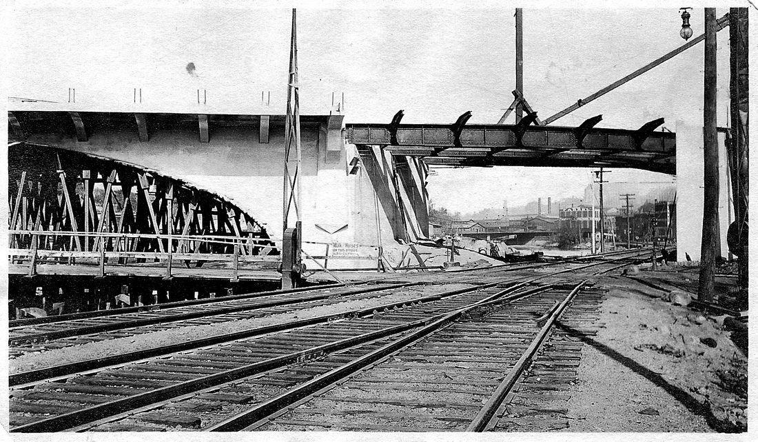 [4.70] These two scenes show the construction of the new Bridge St. bridge and viaduct over the railroad tracks near the NH&D freight house, which is still standing here in 1913. In the first shot, the corner of the freight house is seen at the right. We note that the pillar crane is gone, an indication that perhaps the depot was about to be taken down at this time. In the second shot, the freight house is perhaps out of sight to the right or has been demolished. The approach railings to the soon-to-be-taken-down, 'half-covered' bridge are shown with a sign warning drivers to 'hold their horses.' The new Bridge St. bridge was completed in 1914 and today's bridge was opened in 1960. [rev040615]
