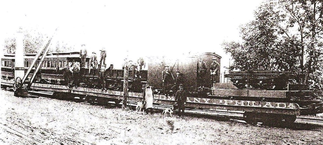 [4.66.2] This is a shot of the Ansonia, Derby & Birmingham trolley cars on the NH&D freight spur in Ansonia where they were delivered in the fall of 1887. The pillar crane is seen to the left. The new equipment sits on the flatcars of maker J.G. Brill. By January of 1888 [NHDP/01/07/1888/00] the trolley cars were moved to the AD&B facility at Main and Water Sts. near the NRR depot and the new cars were reportedly in service on the electric line by April [NHDP/04/25/1888/00]. The AD&B started as the Derby Horse Railroad in 1885 and subsequently had its charter amended to allow it to use electricity and to haul freight as well as passengers. For the former purpose it extended its Main St. Ansonia track down to the dock just below Derby Jct. There it connected with the new Naugatuck Valley Steamboat Co. formed in conjunction with the electric road. The plan was to take Ansonia's industrial products directly to New York and utilize electricity to undercut the rates the railroads were charging. The steam roads did, in fact, cut rates at this time, in response to the AD&B but also due to changes in railroad managements. The NH&D, now aligned with the HRR, and the NRR, leased by the NYNH&H in April of 1887, had just cancelled their 1880 freight-pooling agreement in October and began to compete vigorously. While one might wonder what role the opening of the AD&B played in these developments, the negative impact of the events on the AD&B is certain. Challenged by the increased competition, costly problems with the new technology, and the failure of its fragile boat connection, the freight operation ceased late in 1889. The historic AD&B electric freight engine lives today at the Shore Line Trolley Museum run by the Branford Electric Railway Association [click here]. AD&B passenger service endured and was absorbed in 1900 as part of the CR&L operation between New Haven and Derby that would soon drain riders from the old NH&D line.