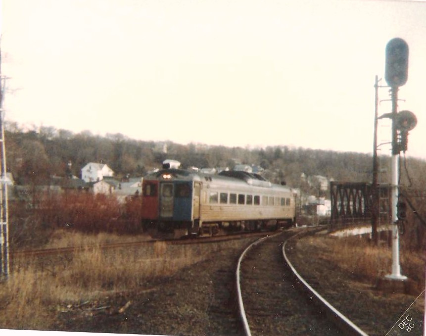 [4.61.6] Two shots looking back at the bridge to Derby Jct. in December 1980, including the Waterbury train of that era heading for the Derby station.