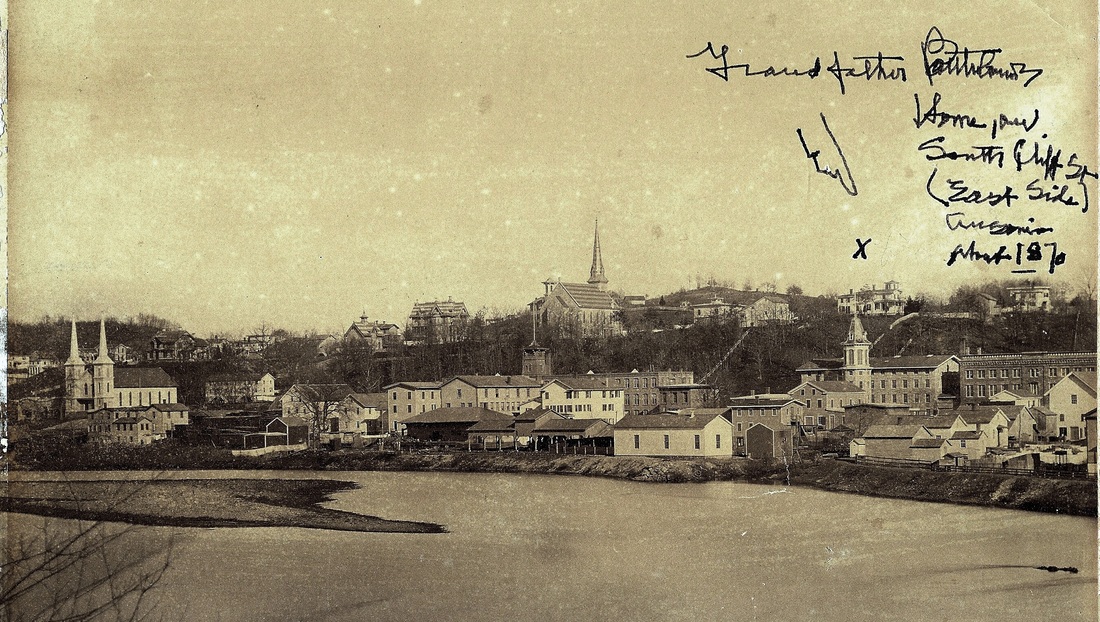 [4.65.1] This valuable panorama of Ansonia in 1870 is among the treasures we discovered in the historical room at the Ansonia Library [click here]. We deliberately did not crop out the family inscription pointing to the home of 'Grandfather' (J.H.) Bartholomew, third president of the NH&D. What is seen here is one of two surviving photographs, this one now newly examined, that shows the original 1849 NRR facilities, including the combination station, the large passenger shed to the right, and the engine house. The locations seem to correspond to the 1856 map above. The shed does not appear on the 1856 map, either not being considered a structure or not being built yet. It probably had to be taken down for the NH&D, which would build right along the riverbank, apparently filling in some areas and putting some of its track on trestle to squeak by the NRR complex. See the 1875 Bailey map below. The fact that the NH&D is nowhere to be seen verifies that this part of the road was not built as of 1870. Apparently the shed was never replaced, since it is not on the 1875 map either. This photograph appeared in the Register in 1963, misdated as ca. 1890 [NHER/04/26/1963/??].
