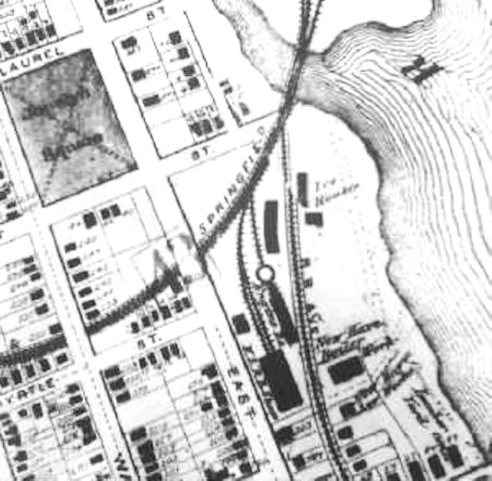 [6.4.3] A wider shot of the entire Consolidated complex in 1879. Note the full roundhouse to replace the one that was dismantled at Long Wharf, and also the numerous other structures. Work on this complex reportedly started in 1869 and culminated with the 1875 station. The tiny Derby road facilities are right above those of the mighty Consolidated. The Derby depot location from 1875 to 1877 was in the small building, second in from the corner of State St., just above the 'St' in West Water St. From March of 1877 until June of 1878 it would move to structure built adjacent to the track at State and West Water Sts. The empty land in the eastern corner of State St. and West Water St. was cleared in 1873 to provide expansion space for the NH&D.