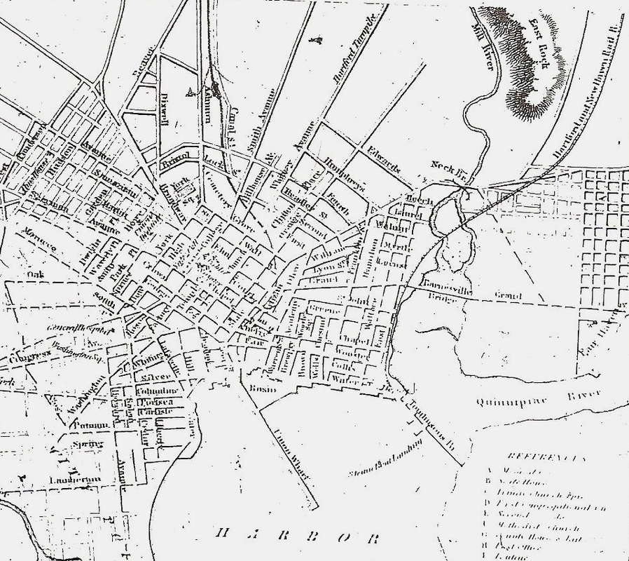[6.1.4] This map is from the 1847-1848 Benham city directory for New Haven. This is the first in the series of directories that would be taken over and published by Price & Lee Co., headquartered right in the Elm City, well into 1960s. Note the Farmington Canal in the center leading down to the triangular basin at the top of the harbor. The canal would become a railroad on the next map. Union Wharf was already better known as Long Wharf for its nearly mile-long reach from the shore.