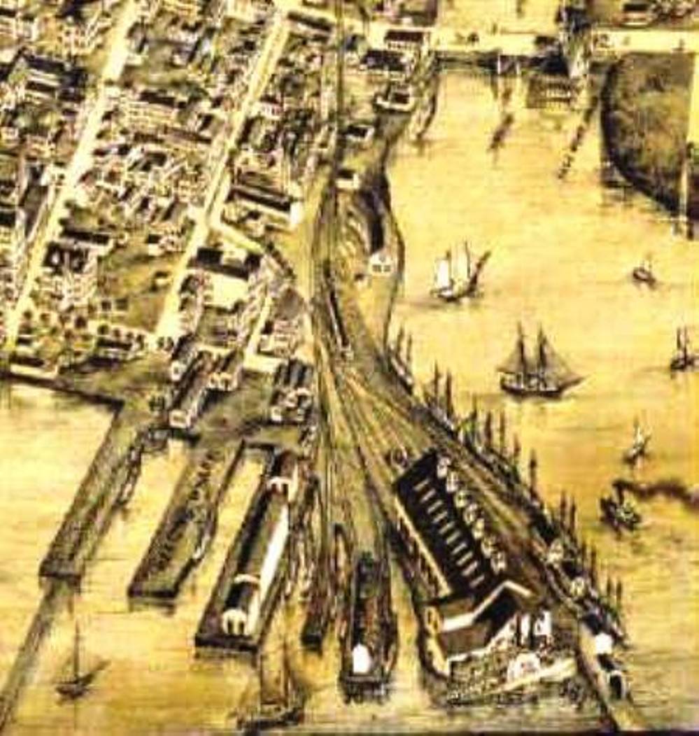 [6.4.6] This shot shows the head of Long Wharf (left) and also the Canal road facilities (right) on the east side of the basin that was filled in back in 1869-1870. Note the absence of the turntable and domed engine house that the NY&NH and the NH&N built jointly in 1848. The only NYNH&H building left is long freight house, formerly the car shop.