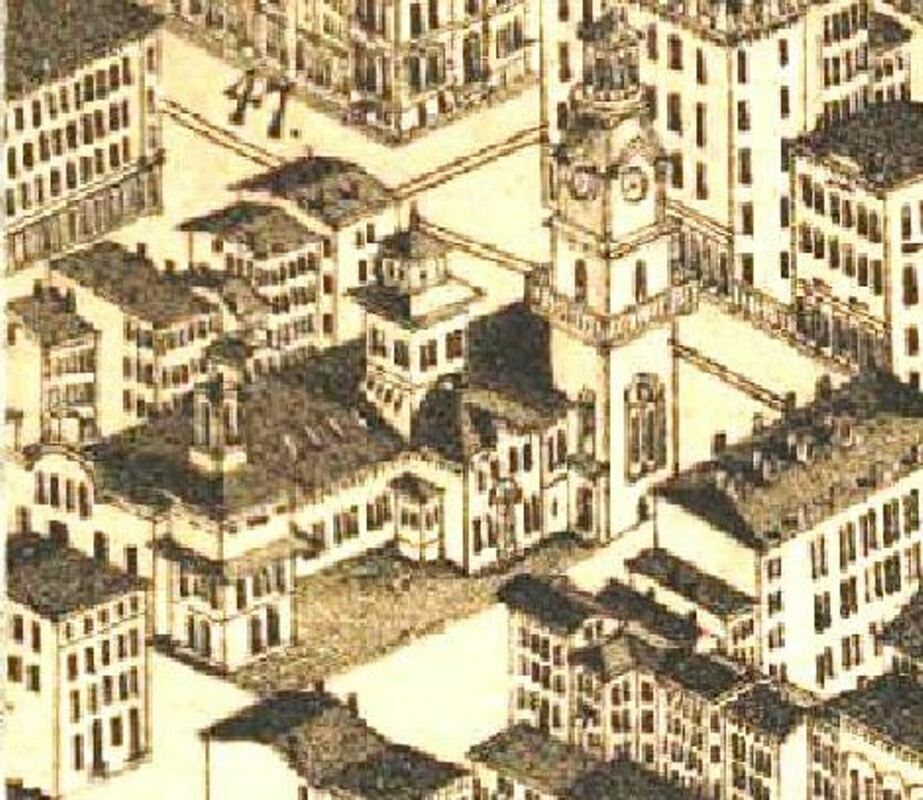 [6.1.8] This 1879 view of Henry Austin's 1848 depot is quite accurate. The large atrium on the front, adjacent to the Chapel St. tower (right), was most likely added after 1875 when the structure was converted to an upscale city market. The detailed architectural plans are at the New Haven Museum.