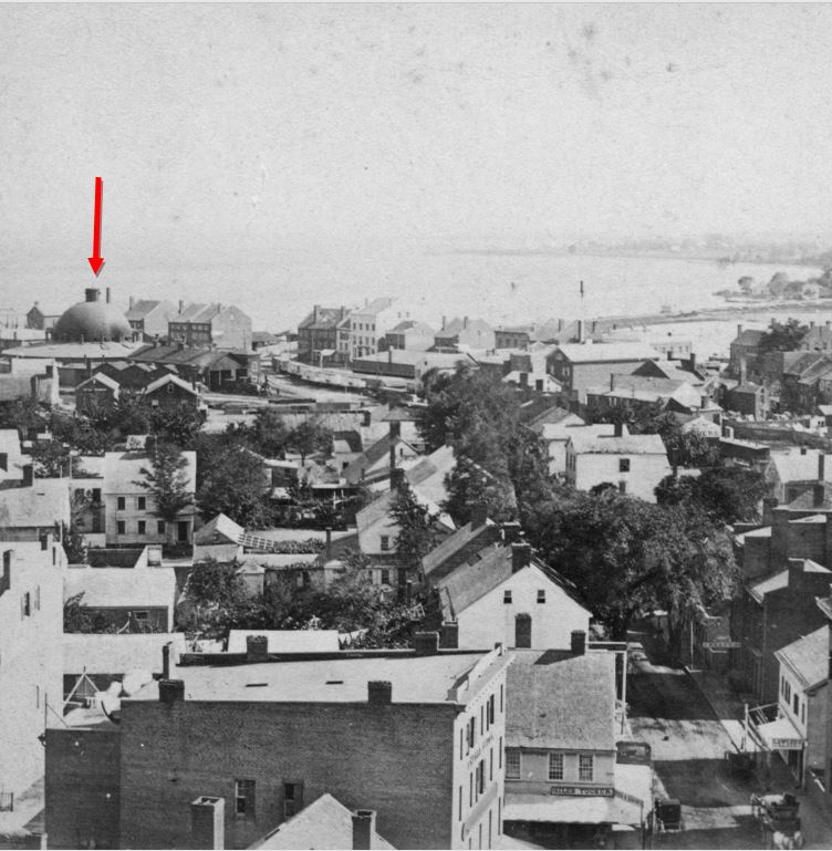 [6.1.6] This view from a stereo card looks south and shows the 1848 domed roundhouse used jointly by the NY&NH and the Canal line. We know from newspaper articles that the Canal line was building a new roundhouse in 1869 so this view probably dates to the mid-1860s. The extension of the Canal dock was part of the new facilities the NH&N built in anticipation of the ending of its lease to the NY&NH on July 1, 1869. See [6.4.6] below for the Canal line facilities in 1879. The arrow on the map above [6.1.5] points to the Engine House that corresponds to the domed structure which looks more like a cathedral than an engine facility. These magnificent structures, with a turntable under the dome, gradually became outmoded as locomotive sizes grew. The NY&NH was also building its new facilities to the west at this time.4a
