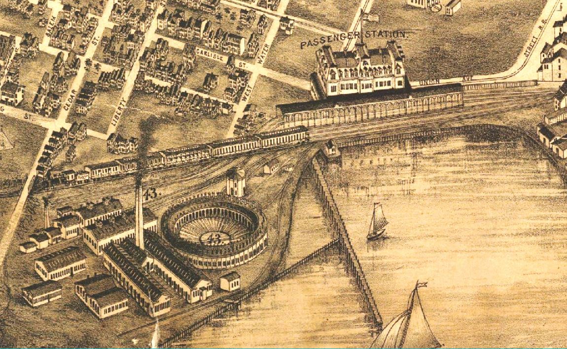 [6.4.7] The east side of the former canal basin is nearly all filled in and holds the extensive NH&N facilties. A Starin line steamer may be heading for the small Derby dock. A newspaper article says that, after a winter ice disruption, the Starin line was once again delivering freight "at her old dock, Derby railroad pier." The NH&D leased pier rights and land for a track to it on October 9, 1873 from the Consolidated and built the wharf early in 1874. The street running across the bottom of the old canal basin begins now to show on maps as Brewery St., continuing out from the 'mainland.' The city made this name official in 1882.39